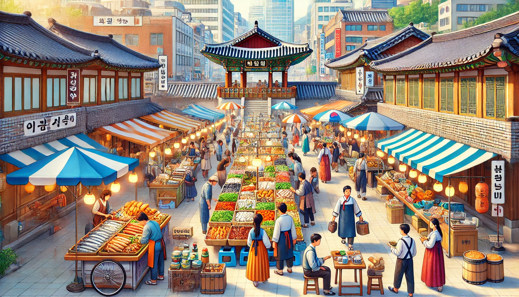 - 길거리 음식 🍢: 찹쌀 도넛, 빈대떡, 떡볶이 등 시장표 간식이 가득!