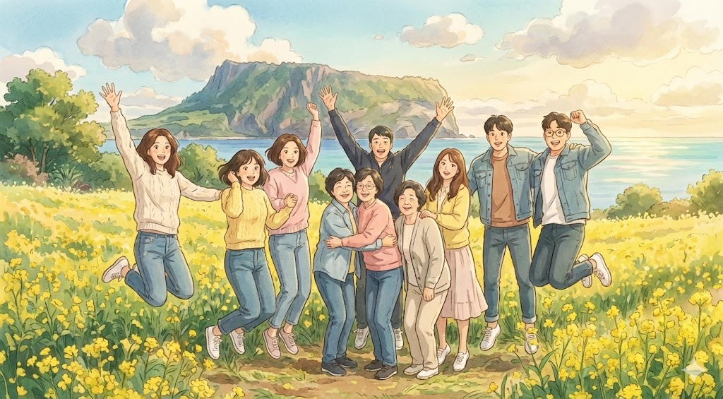 [ 업로드 이미지 ]: 제주도 유채꽃밭에서 찍은 단체 사진