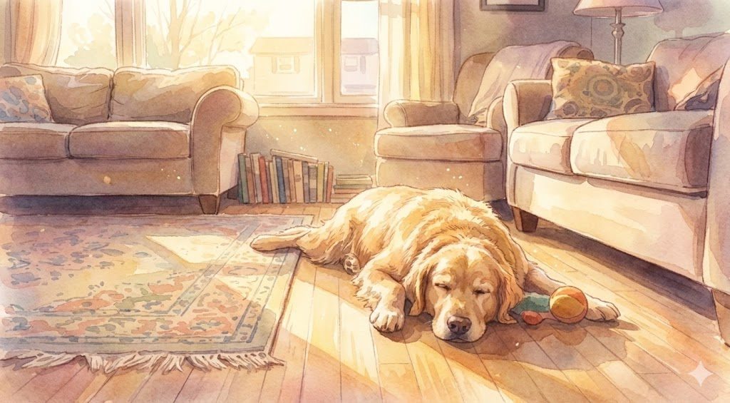 [ 업로드 이미지 ]: 거실 바닥에 배를 깔고 누운 리트리버