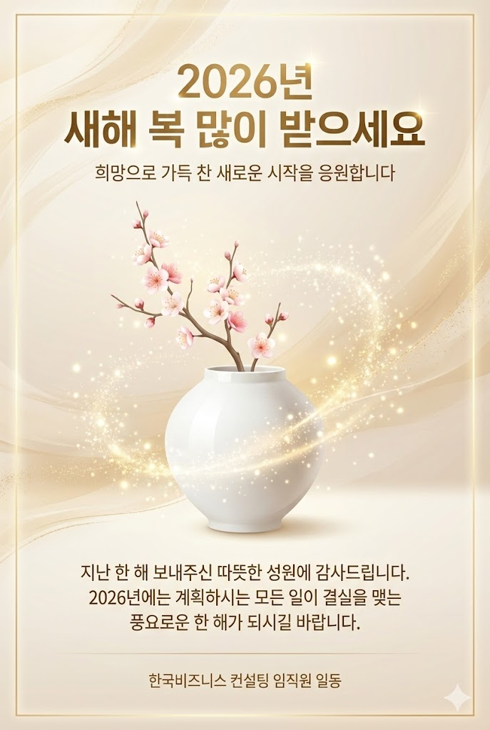 5. Sender Information: Place the sender’s information subtly at the bottom in Korean: "한국비즈니스 컨설팅 임직원 일동".