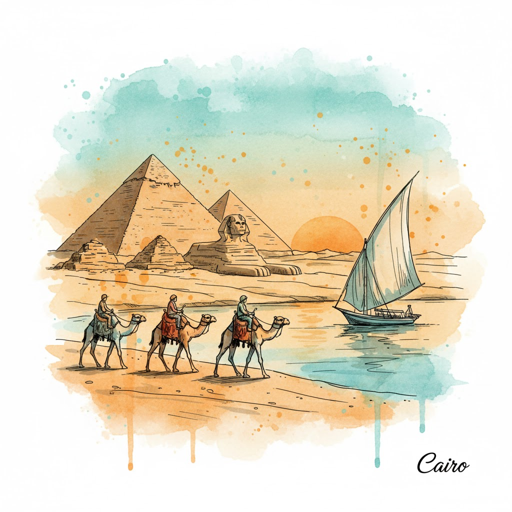 A vibrant watercolor and line art illustration of iconic landmarks and elements from Cairo, Egypt. The image should have a hand-drawn sketch feel with splashes of watercolor in a palette of teal, sandy orange, and golden yellow. Key objects are outlined with distinct black lines. The background should be a soft blend of watercolor washes suggesting a desert sunset. Include a small, prominent handwritten text of Cairo in the bottom right corner. Ensure a sense of depth and movement, possibly with elements like camels silhouetted against the pyramids or feluccas sailing on the Nile.