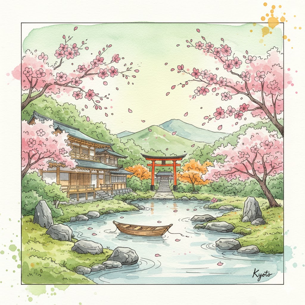 A vibrant watercolor and line art illustration of iconic landmarks and elements from Kyoto, Japan. The image should have a hand-drawn sketch feel with splashes of watercolor in a palette of matcha green-teal, maple leaf orange, and temple gold yellow. Key objects are outlined with distinct black lines. The background should be a soft blend of watercolor washes suggesting a serene garden or misty mountains. Include a small, prominent handwritten text of Kyoto in the bottom right corner. Ensure a sense of depth and movement, possibly with elements like cherry blossom petals drifting down or a small torii gate in the distance.