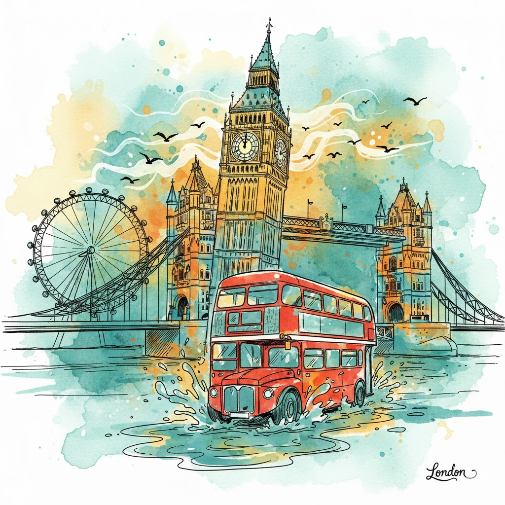 A vibrant watercolor and line art illustration of iconic landmarks and elements from London. The image should have a hand drawn sketch feel with splashes of watercolor in a palette of teal, orange, and yellow. Key objects are outlined with distinct black lines. The background should be a soft blend of watercolor washes. Include a small, prominent handwritten text of London in the bottom right corner. Ensure a sense of depth and movement, possibly with elements like birds or vehicles if relevant to the location