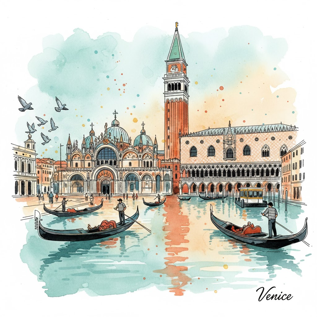 A vibrant watercolor and line art illustration of iconic landmarks and elements from Venice, Italy. The image should have a hand-drawn sketch feel with splashes of watercolor in a palette of seafoam teal, terra cotta orange, and sun-kissed yellow. Key objects are outlined with distinct black lines. The background should be a soft blend of watercolor washes suggesting reflections on water. Include a small, prominent handwritten text of Venice in the bottom right corner. Ensure a sense of depth and movement, possibly with elements like gondolas gliding through canals or pigeons flying near St. Mark's Square.