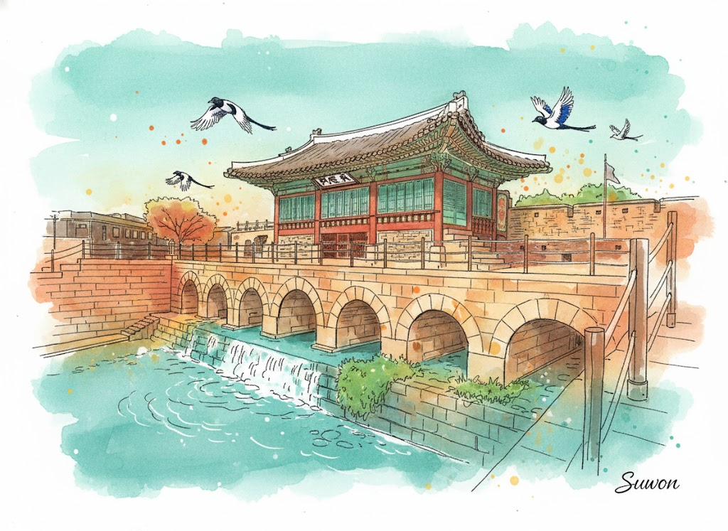 "A vibrant watercolor and line art illustration of the Hwaseong Fortress (화성) in Suwon, South Korea. The image should have a hand-drawn sketch feel with splashes of watercolor in a palette of seafoam teal, terra cotta orange, and sun-kissed yellow. Key objects are outlined with distinct black lines. The background should be a soft blend of watercolor washes, with suggestions of water reflections near the bridge. Include a small, prominent handwritten text of 'Suwon' in the bottom right corner. Ensure a sense of depth and movement, with traditional Korean magpies flying in the sky."