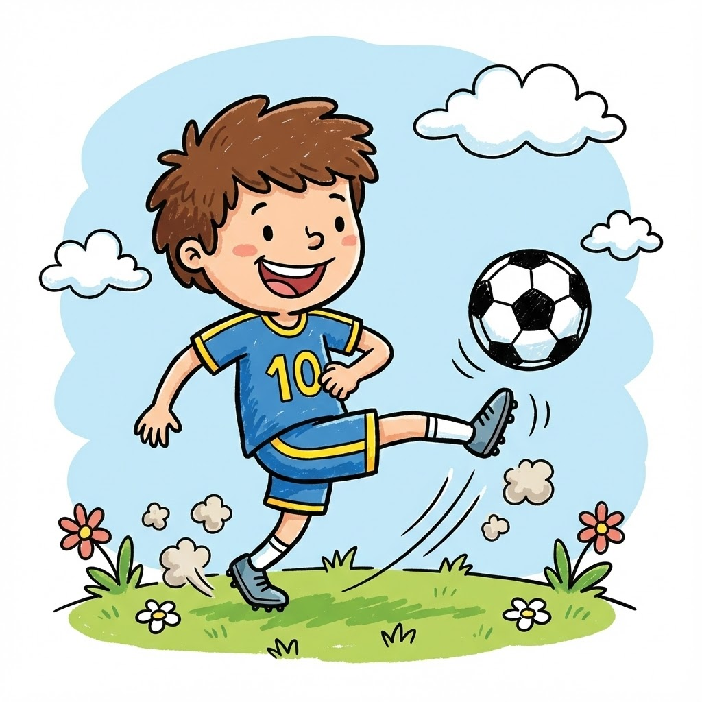 A cartoon illustration in a playful, hand-drawn vector art style with thick dark outlines and simple, cheerful coloring. It features an energetic young boy with messy brown hair wearing a soccer uniform, kicking a soccer ball powerfully with a big grin on his face. The setting is a simple, stylized green grass patch against a light blue sky background with vague, fluffy white cloud shapes. The overall mood is happy, energetic, and childlike. --ar 1:1