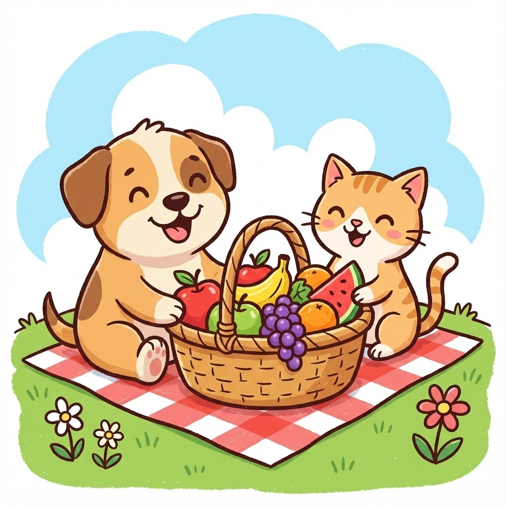 A cartoon illustration in a playful, hand-drawn vector art style with thick dark outlines and simple, cheerful coloring. It features a cute chubby puppy and a small kitten smiling and sharing a large picnic basket filled with cartoon fruits on a checkered blanket. The setting is a simple, stylized green grass patch against a light blue sky background with vague, fluffy white cloud shapes. The overall mood is happy, energetic, and childlike. --ar 1:1