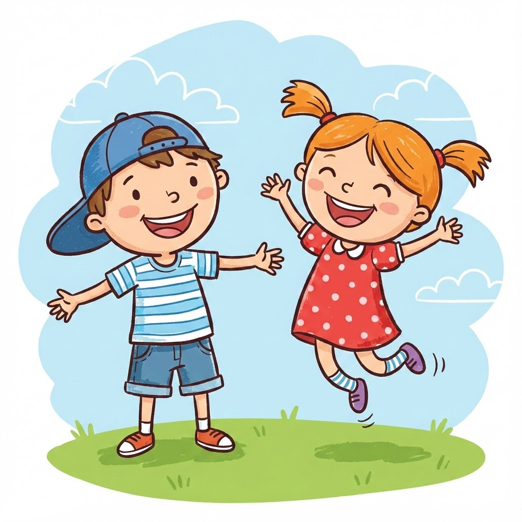 A cartoon illustration in a playful, hand-drawn vector art style with thick dark outlines and simple, cheerful coloring. It features a happy boy wearing a blue backward cap and striped t-shirt standing with open arms, and a joyful girl with orange pigtails in a red polka-dot dress jumping high in the air. The setting is a simple, stylized green grass patch against a light blue sky background with vague, fluffy white cloud shapes. The overall mood is happy, energetic, and childlike. --ar 1:1
