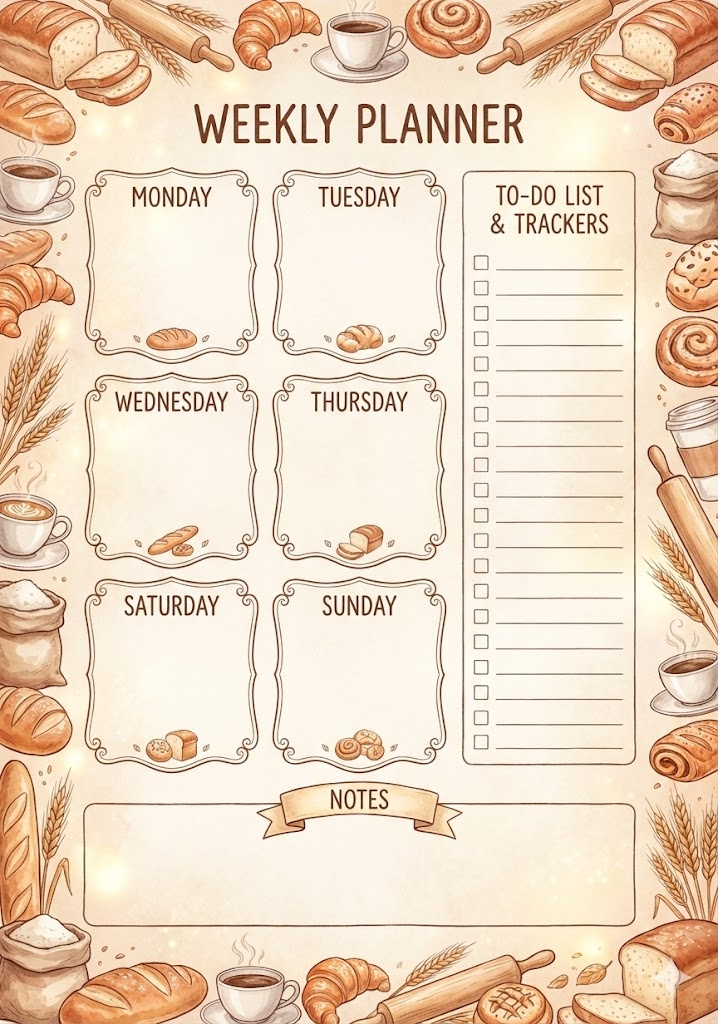 A professional, vertical A4-sized single-page weekly planner template designed in a whimsical watercolor fairytale style. The layout features structured, elegant boxes for 'Monday' through 'Sunday', a dedicated sidebar for a 'To-Do List' or 'Trackers', and a 'Notes' section. The entire page is intricately framed with decorative borders and motifs based on Cozy Vintage Bakery, featuring freshly baked bread, croissants, warm coffee cups, wheat stalks, and a warm palette of beige, terracotta, and soft brown. The style is a high-quality storybook illustration with soft textures, charming hand-drawn typography, and a clean, organized layout on a subtle paper texture. 8k resolution, magical and aesthetic.