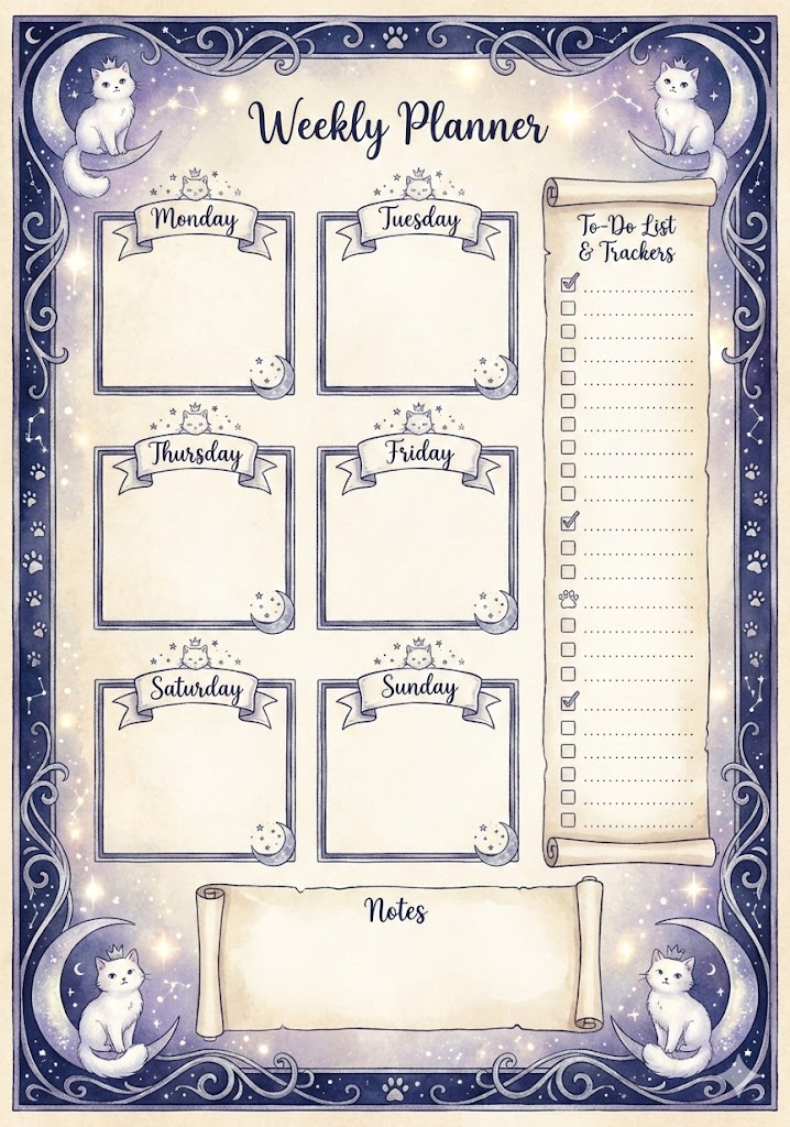 A professional, vertical A4-sized single-page weekly planner template designed in a whimsical watercolor fairytale style. The layout features structured, elegant boxes for 'Monday' through 'Sunday', a dedicated sidebar for a 'To-Do List' or 'Trackers', and a 'Notes' section. The entire page is intricately framed with decorative borders and motifs based on Celestial Space Cats, featuring fluffy white cats sitting on crescent moons, tiny stars, constellations, and a magical palette of navy blue, purple, and shimmering silver. The style is a high-quality storybook illustration with soft textures, charming hand-drawn typography, and a clean, organized layout on a subtle paper texture. 8k resolution, magical and aesthetic.