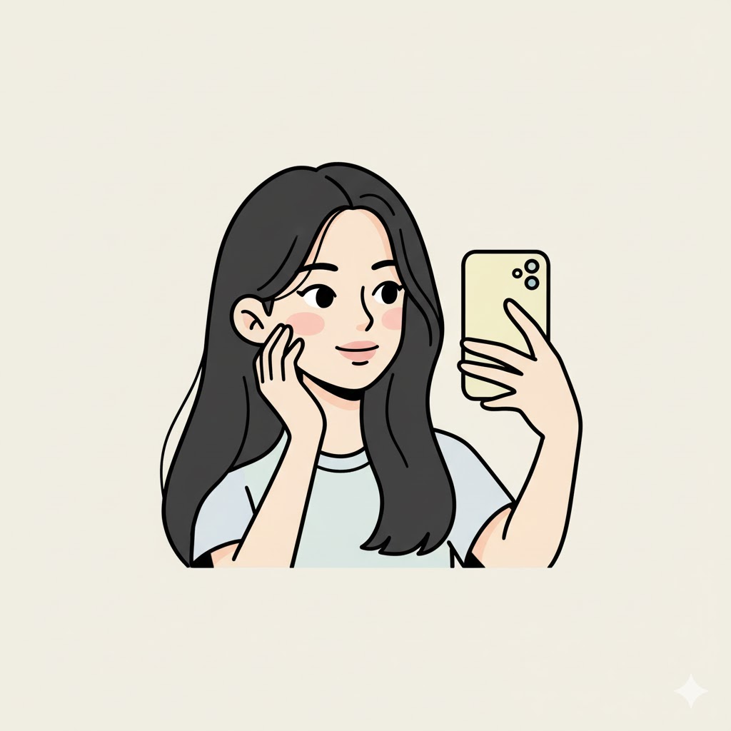 [Upload Image] is taking a selfie with a cellphone. It is drawn in a cute cartoon style with simple lines and pastel tones. The illustration features a minimal, flat design with a monochrome background.