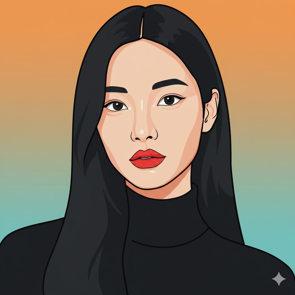 An illustration depicting [Upload Image], featuring bold lines and flat colors reminiscent of mid-20th century pop art aesthetics. The background should be rendered with a simple gradient that complements the characteristics of [Upload Image]. [Upload Image] is wearing a [black turtleneck sweater and red lipstick].