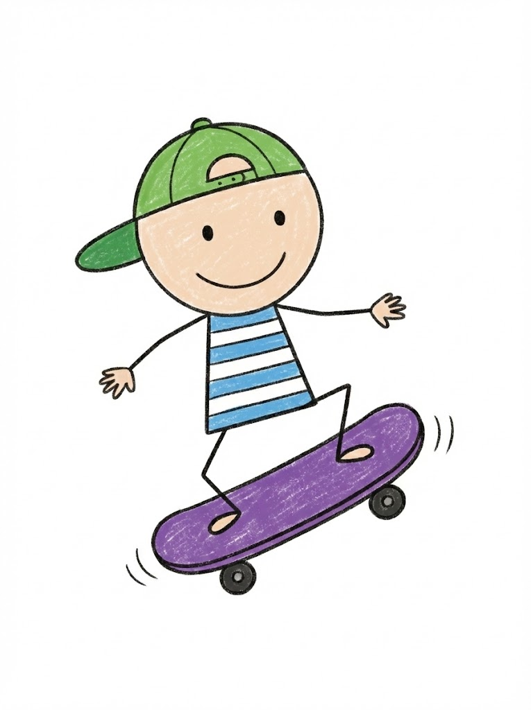 A cartoon illustration in the distinct hand-drawn, stick-figure style seen in image_0.png. The character has a large circular head, simple facial features, and thin limbs. Depict a cool child with a green cap worn backwards and a striped blue shirt, balancing skillfully on a purple skateboard. The coloring is simple and flat. The background is a solid, pure white with no patterns, textures, or distractions, creating a clean look. The overall feel is playful, childlike, and simple. --ar 3:4