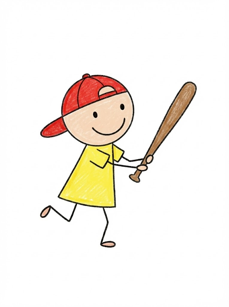 A cartoon illustration in the distinct hand-drawn, stick-figure style seen in image_0.png. The character has a large circular head, simple facial features, and thin limbs. Depict a cheerful boy wearing a bright red baseball cap and a yellow shirt, holding a wooden baseball bat and ready to swing. The coloring is simple and flat. The background is a solid, pure white with no patterns, textures, or distractions, creating a clean look. The overall feel is playful, childlike, and simple. --ar 3:4