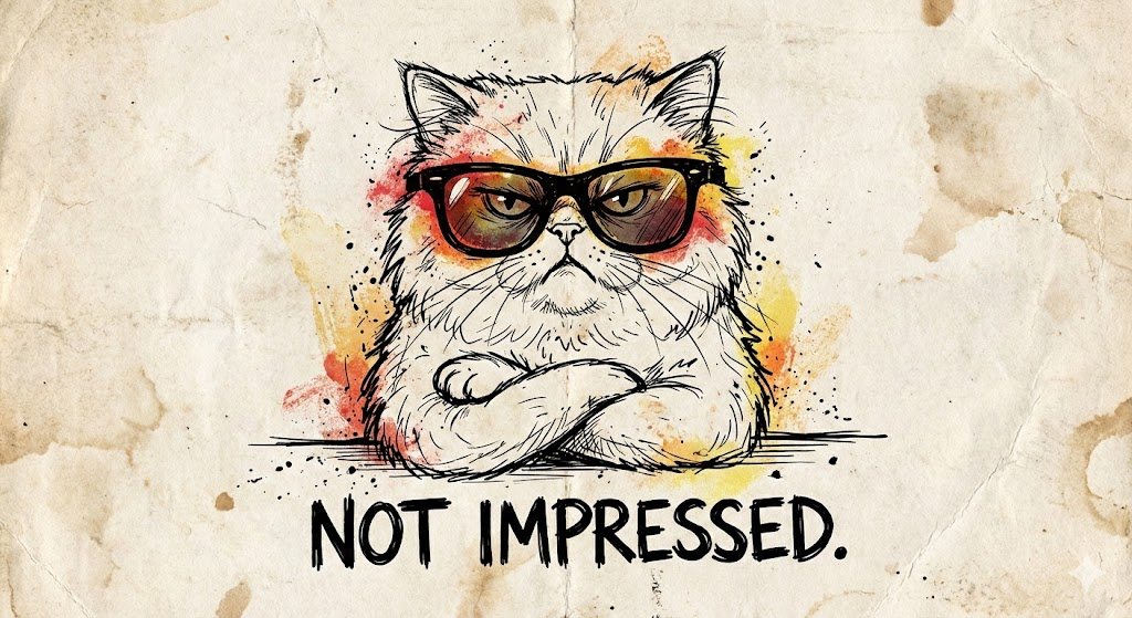 A single illustration in the style of a rough, black ink line art sketch with limited grunge color accents (yellow, orange, or red) on a textured paper background, similar to the examples in the image sheet. The illustration features [a fluffy Persian cat wearing oversized sunglasses, sitting with arms crossed and looking disdainfully at the viewer]. Below or beside the character, there is bold, hand-drawn typography with the caption: ["Not impressed"]. The overall mood is cynical, humorous, or edgy.