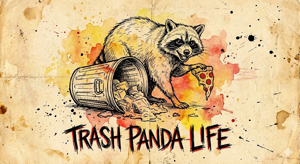 A single illustration in the style of a rough, black ink line art sketch with limited grunge color accents (yellow, orange, or red) on a textured paper background, similar to the examples in the image sheet. The illustration features [a raccoon rummaging through a trash can with a mischievous grin, holding a half-eaten pizza slice]. Below or beside the character, there is bold, hand-drawn typography with the caption: ["Trash panda life"]. The overall mood is cynical, humorous, or edgy.
