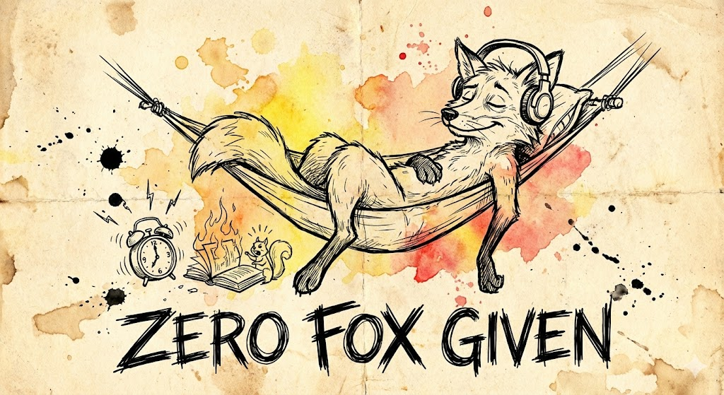 A single illustration in the style of a rough, black ink line art sketch with limited grunge color accents (yellow, orange, or red) on a textured paper background, similar to the examples in the image sheet. The illustration features [a fox lounging in a hammock, wearing headphones and ignoring everything around it]. Below or beside the character, there is bold, hand-drawn typography with the caption: ["Zero fox given"]. The overall mood is cynical, humorous, or edgy.