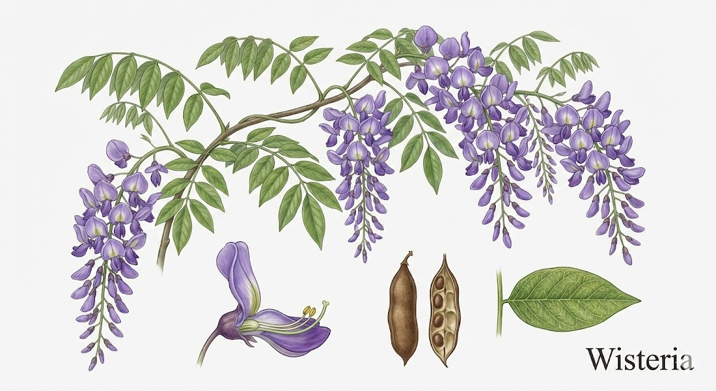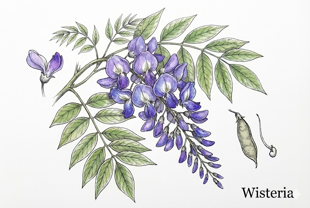Prompt:Scientific botanical chart of a [Wisteria] plant showing multiple elements: full blooming branch, individual floret dissection, seed pod, and leaf vein details. Educational textbook style, hyper-realistic and anatomically correct. Neutral lighting, isolated on a white background. Include the text ["Wisteria"]in an elegant serif font in the bottom right corner.