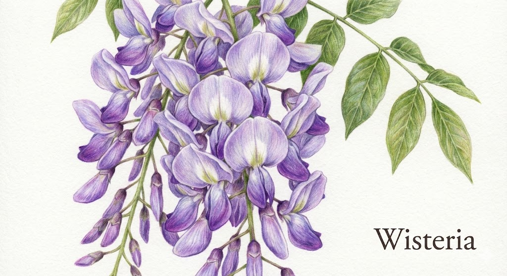 Prompt:Hyper-realistic colored pencil botanical drawing of a cascading [Wisteria]. Visible paper grain texture, soft blending, and precise layering of colors. Focus on the velvet texture of the petals. Fine art style. Isolated on a clean white background. Include the text ["Wisteria"] in an elegant serif font in the bottom right corner.