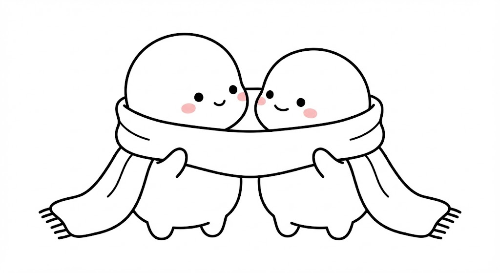 Create a minimalist black line art illustration of two cute, round, chibi-style characters. They are white with small pink blush on their cheeks, set against a plain white background. The two characters are [sharing a long, cozy scarf, looking at each other with smiles].
