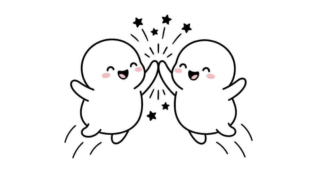 Create a minimalist black line art illustration of two cute, round, chibi-style characters. They are white with small pink blush on their cheeks, set against a plain white background. The two characters are [jumping and high-fiving each other enthusiastically, with small star shapes around their hands].