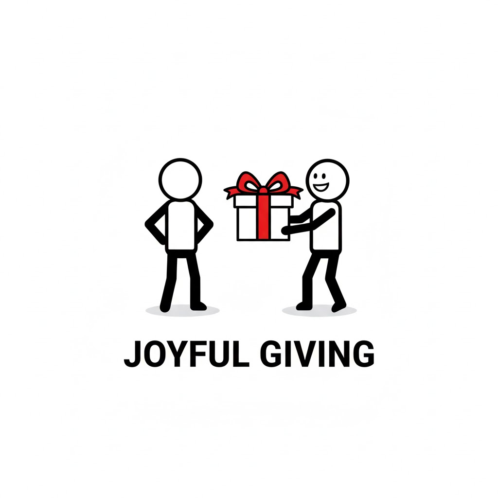 Minimalist logo design, a black outline stick figure character interacting with [a figure happily presenting a gift box wrapped with a bright red ribbon]. The figure is simple black lines with a circular head. Key objects or details are accented with flat red color. Clean white background, subtle shadow beneath the figure. Modern sans-serif typography below stating a fictional brand name.