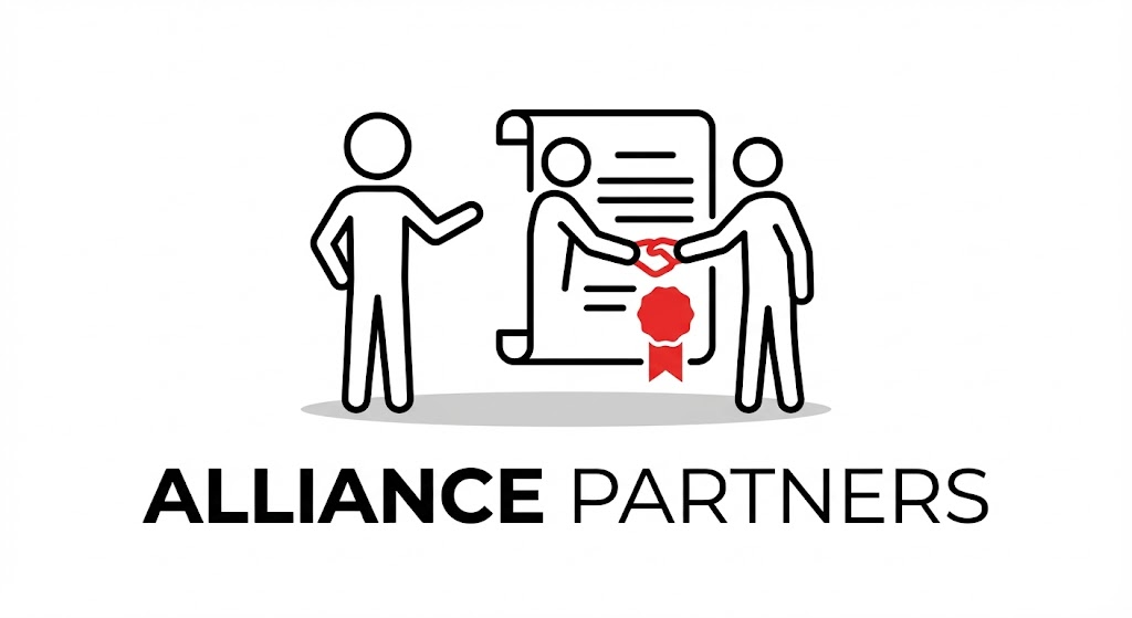 Minimalist logo design, a black outline stick figure character interacting with [two figures shaking hands over a contract with a red seal]. The figure is simple black lines with a circular head. Key objects or details are accented with flat red color. Clean white background, subtle shadow beneath the figure. Modern sans-serif typography below stating a fictional brand name.