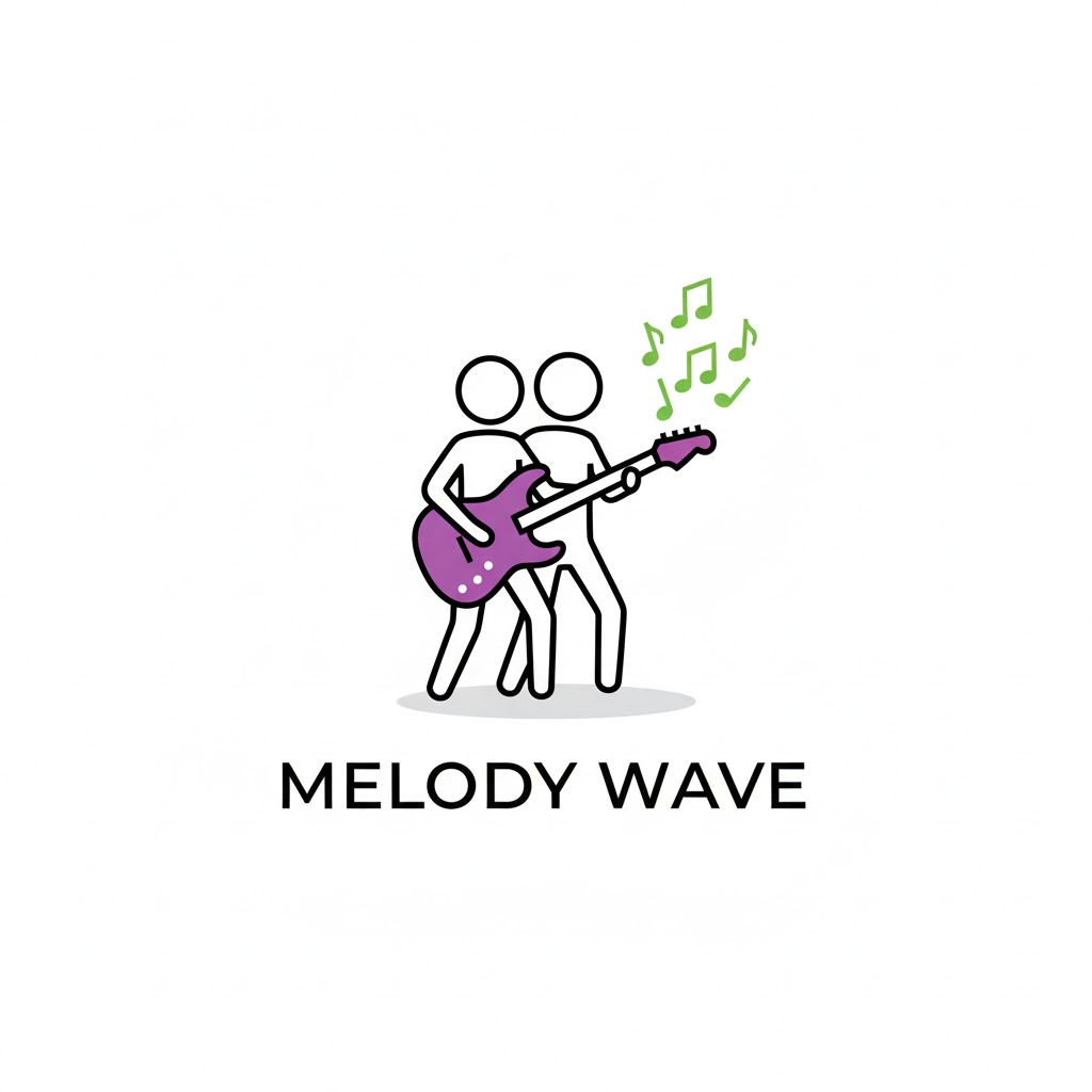 "Minimalist logo design, a black outline stick figure character interacting with [a figure playing an electric guitar with green musical notes flying out]. The figure is simple black lines with a circular head. Key objects or details are accented with flat purple color. Clean white background, subtle shadow beneath the figure. Modern sans-serif typography below stating a fictional brand name."