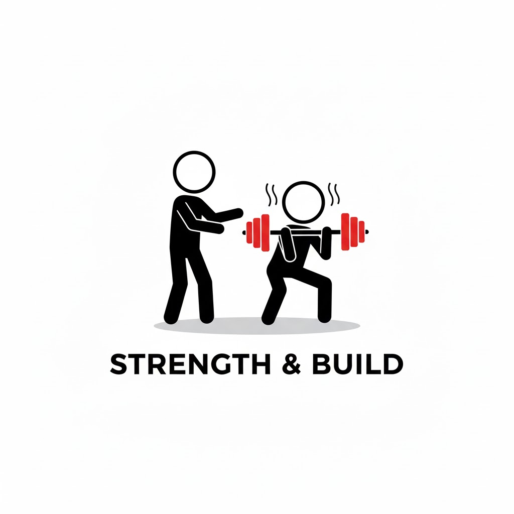 Minimalist logo design, a black outline stick figure character interacting with [a figure lifting a heavy dumbbell accented with red on the weights]. The figure is simple black lines with a circular head. Key objects or details are accented with flat red color. Clean white background, subtle shadow beneath the figure. Modern sans-serif typography below stating a fictional brand name.
