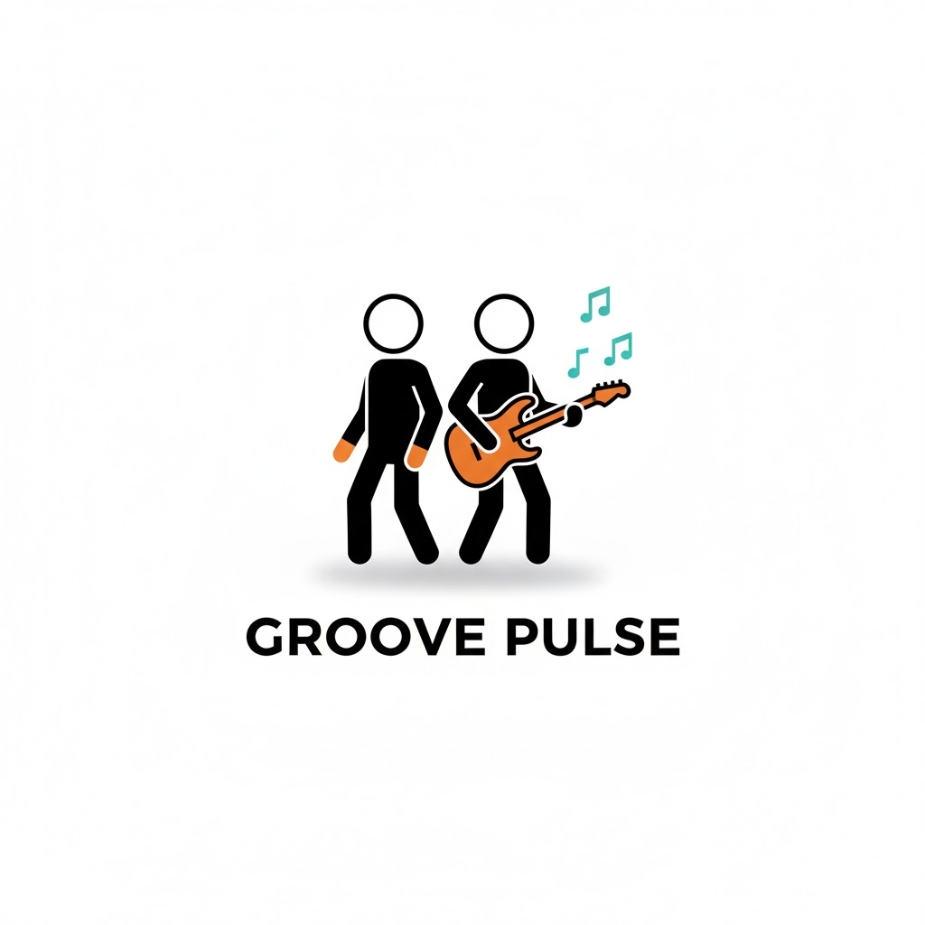 "Minimalist logo design, a black outline stick figure character interacting with [a figure playing an electric guitar with teal musical notes flying out]. The figure is simple black lines with a circular head. Key objects or details are accented with flat orange color. Clean white background, subtle shadow beneath the figure. Modern sans-serif typography below stating a fictional brand name."