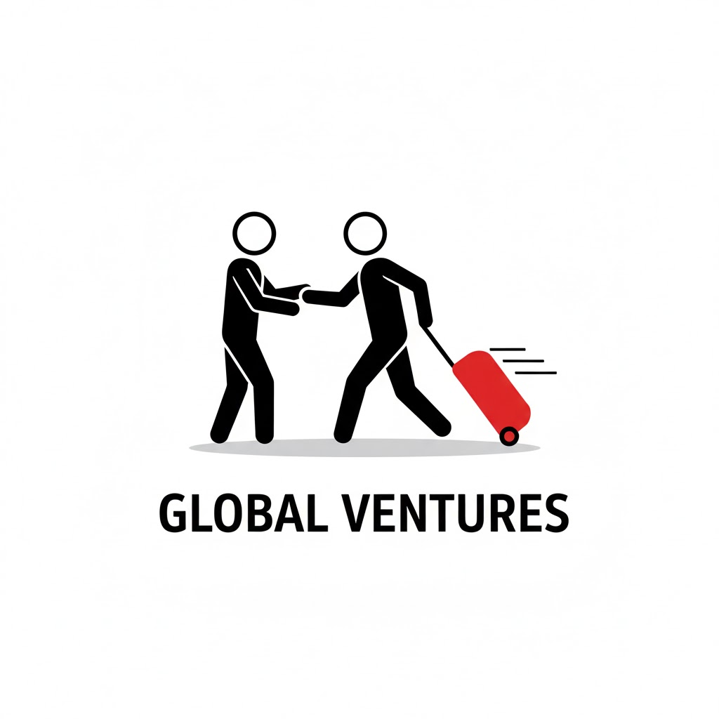Minimalist logo design, a black outline stick figure character interacting with [a business figure walking briskly while pulling a rolling suitcase colored in red]. The figure is simple black lines with a circular head. Key objects or details are accented with flat red color. Clean white background, subtle shadow beneath the figure. Modern sans-serif typography below stating a fictional brand name.