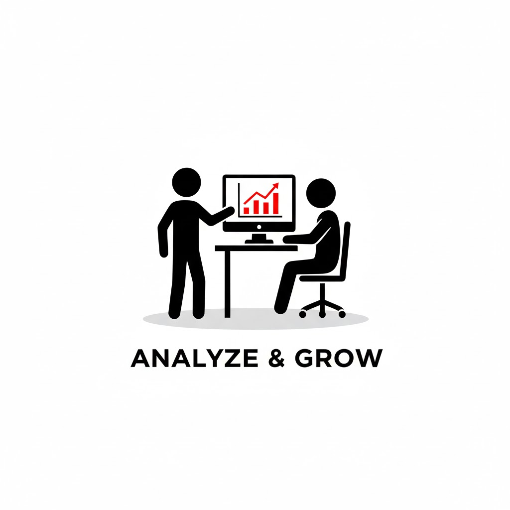 Minimalist logo design, a black outline stick figure character interacting with [a figure sitting at a desk working on a computer showing a red graph]. The figure is simple black lines with a circular head. Key objects or details are accented with flat red color. Clean white background, subtle shadow beneath the figure. Modern sans-serif typography below stating a fictional brand name.