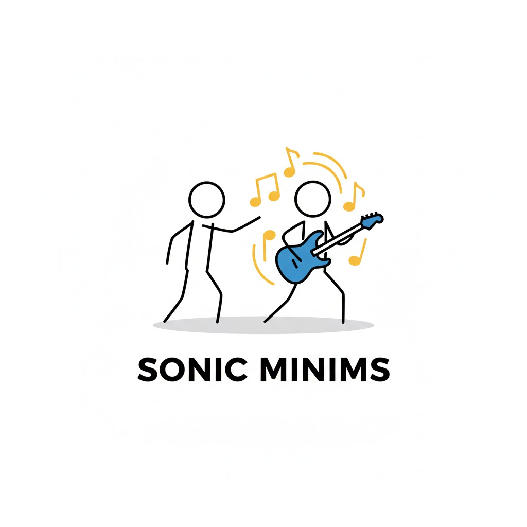 "Minimalist logo design, a black outline stick figure character interacting with [a figure playing an electric guitar with yellow musical notes flying out]. The figure is simple black lines with a circular head. Key objects or details are accented with flat blue color. Clean white background, subtle shadow beneath the figure. Modern sans-serif typography below stating a fictional brand name."