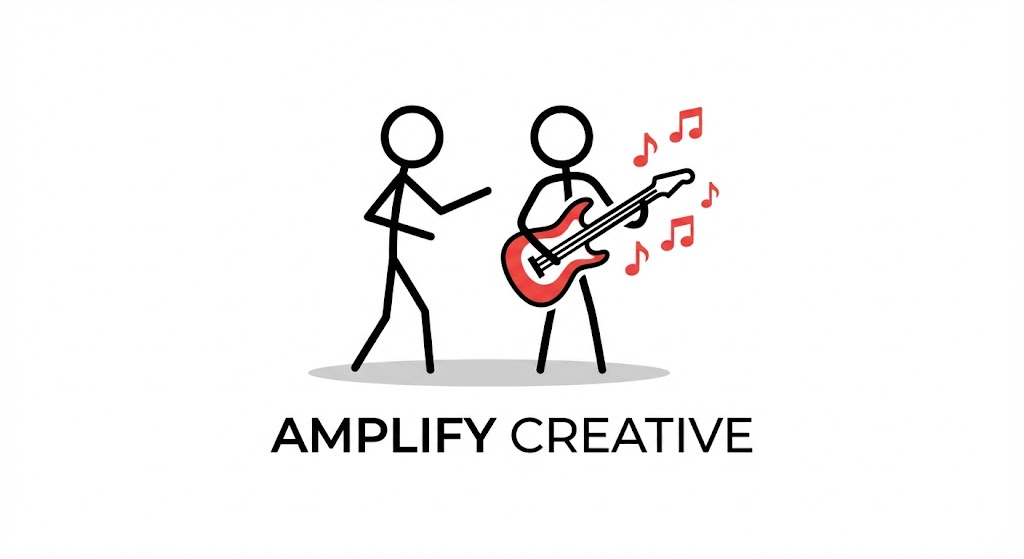 Minimalist logo design, a black outline stick figure character interacting with [a figure playing an electric guitar with red musical notes flying out]. The figure is simple black lines with a circular head. Key objects or details are accented with flat red color. Clean white background, subtle shadow beneath the figure. Modern sans-serif typography below stating a fictional brand name.