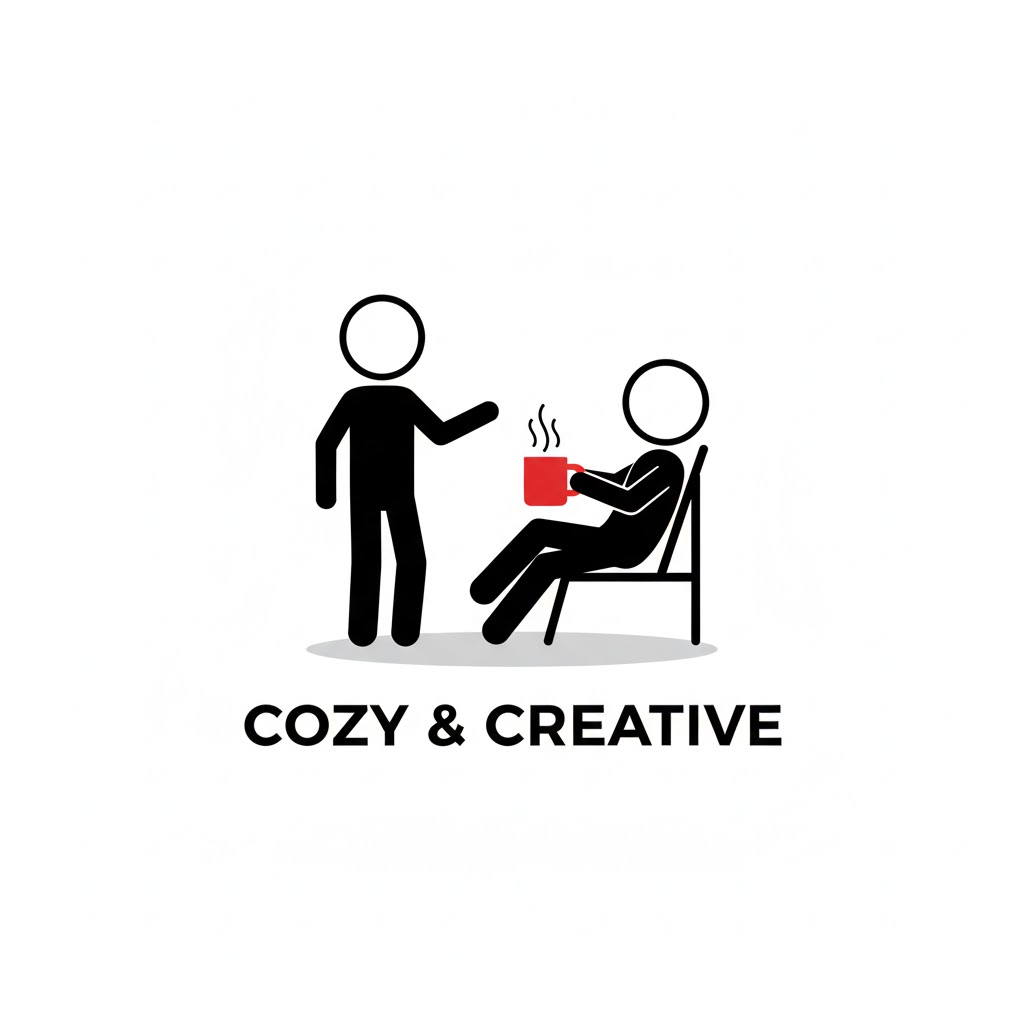 Minimalist logo design, a black outline stick figure character interacting with [a figure relaxing while holding a steaming hot coffee mug colored in red]. The figure is simple black lines with a circular head. Key objects or details are accented with flat red color. Clean white background, subtle shadow beneath the figure. Modern sans-serif typography below stating a fictional brand name.