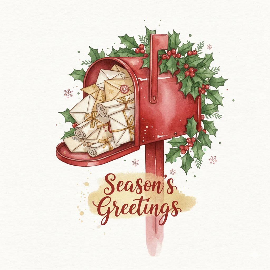 A full-frame, edge-to-edge digital watercolor illustration for a Christmas card featuring a vintage red mailbox overflowing with letters and holly decorations. The image is a clean 2D design filling the entire canvas with no borders, no hands, and no background surroundings. The style creates a wet-on-wet watercolor effect with visible paper texture. Elegant, flowing English handwritten calligraphy text reading "Season's Greetings" is composed centrally. Festive colors of red, green, and gold. High quality, printable art. --ar 3:4 --no hands, holding, table, pencils, 3d, mockup, blur