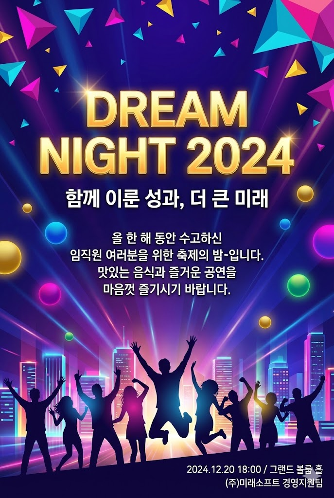 - The main body text: "올 한 해 동안 수고하신 임직원 여러분을 위한 축제의 밤입니다. 맛있는 음식과 즐거운 공연을 마음껏 즐기시기 바랍니다."