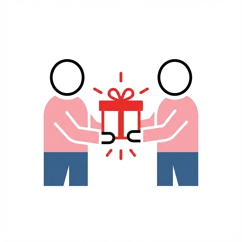 Minimalist logo design, square composition, 1:1 aspect ratio, Two minimalist figures exchanging a gift box. The characters are dressed in flat solid Pastel Pink tops and flat solid Denim Blue bottoms. Their heads are depicted as simple black circular outlines with white interiors (hollow heads). Key objects or details within the theme are accented with flat Vivid Red color. Plain solid white background, no shadows. High contrast, emphasizing negative space. No typography, no text, centered layout at 70% scale.