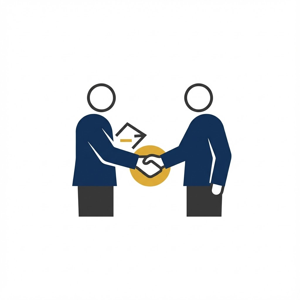 Minimalist logo design, square composition, 1:1 aspect ratio, Two minimalist figures shaking hands firmly implying a business deal. The characters are dressed in flat solid Navy Blue tops and flat solid Dark Grey bottoms. Their heads are depicted as simple black circular outlines with white interiors (hollow heads). Key objects or details within the theme are accented with flat Golden Yellow color. Plain solid white background, no shadows. High contrast, emphasizing negative space. No typography, no text, centered layout at 70% scale.