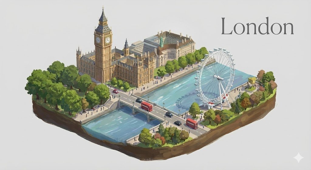 An artistic digital diorama illustration of London. The composition features a miniature-style scene or a small floating island isolated on a clean, solid light-gray background. In the center, there is a detailed and vibrant depiction of the Big Ben, Westminster Bridge, and the London Eye. The scene is populated with tiny people, characteristic red double-decker buses, and lush seasonal greenery like deep green plane trees. The style is painterly and expressive with soft, natural lighting and a high-angle isometric perspective. The city name "London" is elegantly displayed in a clean font in one of the top corners.