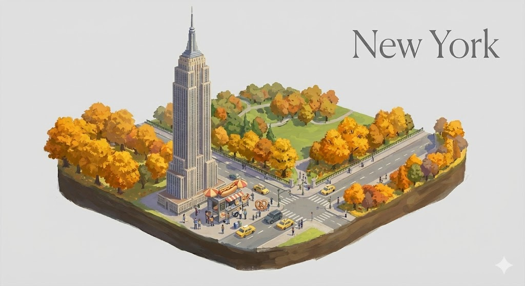 An artistic digital diorama illustration of New York City. The composition features a miniature-style scene or a small floating island isolated on a clean, solid light-gray background. In the center, there is a detailed and vibrant depiction of the Empire State Building and a corner of Central Park with a street food stall. The scene is populated with tiny people, characteristic yellow taxi cabs, and lush seasonal greenery like golden and orange maple trees. The style is painterly and expressive with soft, natural lighting and a high-angle isometric perspective. The city name "New York" is elegantly displayed in a clean font in one of the top corners.