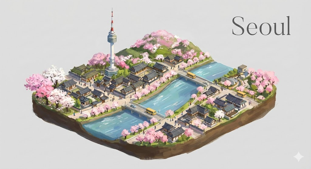 An artistic digital diorama illustration of Seoul. The composition features a miniature-style scene or a small floating island isolated on a clean, solid light-gray background. In the center, there is a detailed and vibrant depiction of N Seoul Tower and traditional Hanok houses with the Han River flowing nearby. The scene is populated with tiny people, characteristic yellow buses, and lush seasonal greenery like vibrant pink cherry blossoms in full bloom. The style is painterly and expressive with soft, natural lighting and a high-angle isometric perspective. The city name "Seoul" is elegantly displayed in a clean font in one of the top corners.