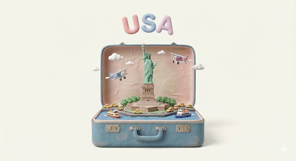 A charming miniature diorama presented inside an open blue vintage suitcase, showcasing a detailed landmark of USA. The central focus is the Statue of Liberty on Liberty Island, surrounded by tiny yellow taxi cabs and bustling ferries in the harbor, crafted in a playful clay art and 3D rendering style. Floating above the scene is the 3D text "USA". The overall feel is whimsical, with soft textures, pastel colors, and tiny clouds or airplanes, isolated on a clean background.