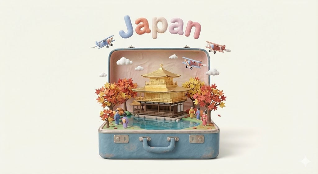 A charming miniature diorama presented inside an open blue vintage suitcase, showcasing a detailed landmark of Japan. The central focus is the Golden Pavilion (Kinkaku-ji) reflecting in a pond, surrounded by autumn maple trees and tiny figures in kimonos, crafted in a playful clay art and 3D rendering style. Floating above the scene is the 3D text "Japan". The overall feel is whimsical, with soft textures, pastel colors, and tiny clouds or airplanes, isolated on a clean background.