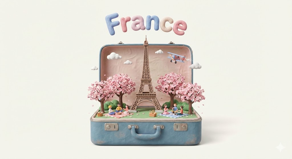 A charming miniature diorama presented inside an open blue vintage suitcase, showcasing a detailed landmark of France. The central focus is the Eiffel Tower with tiny cherry blossom trees and people having a picnic below, crafted in a playful clay art and 3D rendering style. Floating above the scene is the 3D text "France". The overall feel is whimsical, with soft textures, pastel colors, and tiny clouds or airplanes, isolated on a clean background.
