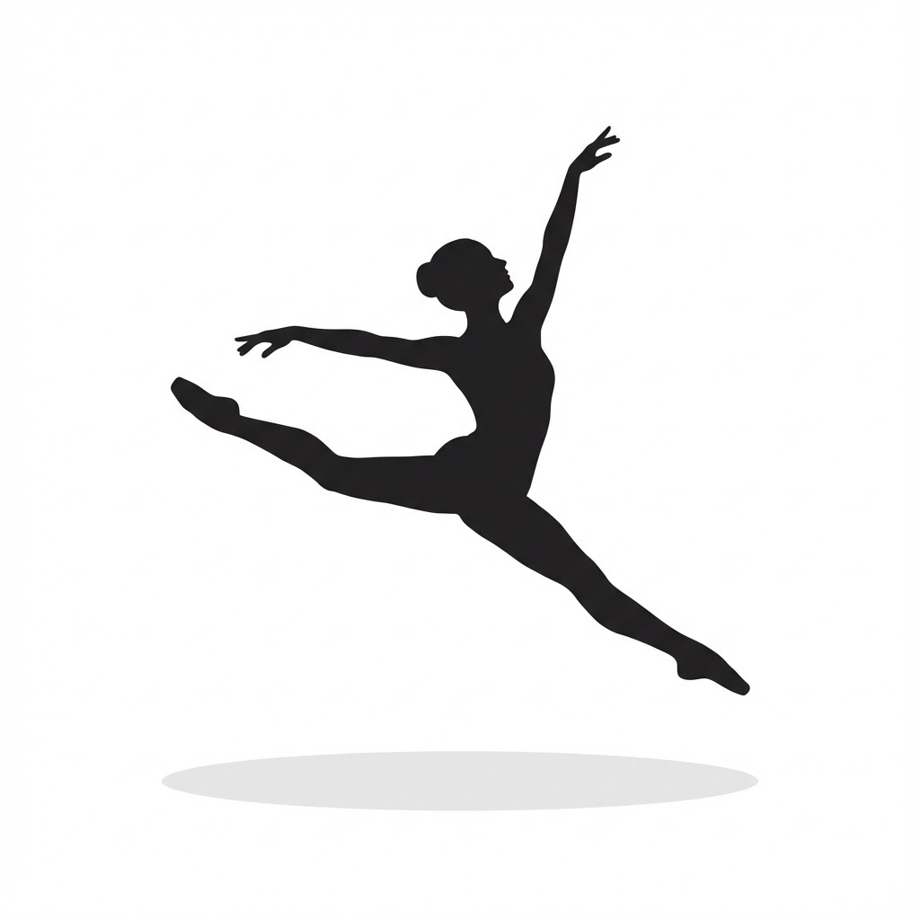 A high-contrast, all-black silhouette of [a ballerina performing a grand jeté leap] isolated on a pure white background. The style is minimalist vector art with sharp, clean edges. Capture a dynamic moment of motion. Include a subtle, soft shadow on the ground to anchor the figure. Professional sports icon aesthetics, flat design, monochrome. --ar 1:1