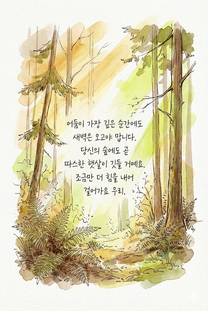 A full-bleed, edge-to-edge digital illustration presenting a refined art piece simulated on high-quality Premium art paper with a subtle texture. There are no borders, margins, or external backgrounds. In the center, a paragraph of handwritten Korean text spanning multiple lines using a fine black ink pen that reads "어둠이 가장 깊은 순간에도 새벽은 오고야 맙니다. 당신의 숲에도 곧 따스한 햇살이 깃들 거예요. 조금만 더 힘을 내어 걸어가요 우리.". Around and interspersed with the text block, a beautiful and symbolic illustration of a dense forest floor with ferns and tall trees, bathed in shafts of morning golden light creating sunbeams drawn as an expressive sketch using brown and olive green ink pens, loosely filled in with translucent watercolor washes of warm gold, fresh lime green, and earthy browns. The pen lines remain visible underneath the soft, layered paint. The composition is clean, balanced, and aesthetic. No traditional stamps or seals. High resolution. --ar 2:3