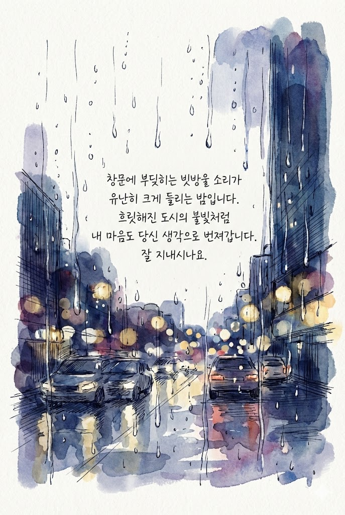 A full-bleed, edge-to-edge digital illustration presenting a refined art piece simulated on high-quality Premium art paper with a subtle texture. There are no borders, margins, or external backgrounds. In the center, a paragraph of handwritten Korean text spanning multiple lines using a fine black ink pen that reads "창문에 부딪히는 빗방울 소리가 유난히 크게 들리는 밤입니다. 흐릿해진 도시의 불빛처럼 내 마음도 당신 생각으로 번져갑니다. 잘 지내시나요.". Around and interspersed with the text block, a beautiful and symbolic illustration of a rainy window view looking out onto a blurred city street with bokeh lights of cars and buildings drawn as an expressive sketch using dark blue and grey ink pens, loosely filled in with translucent watercolor washes of moody blues, purples, and diffused warm yellows. The pen lines remain visible underneath the soft, layered paint. The composition is clean, balanced, and aesthetic. No traditional stamps or seals. High resolution. --ar 2:3