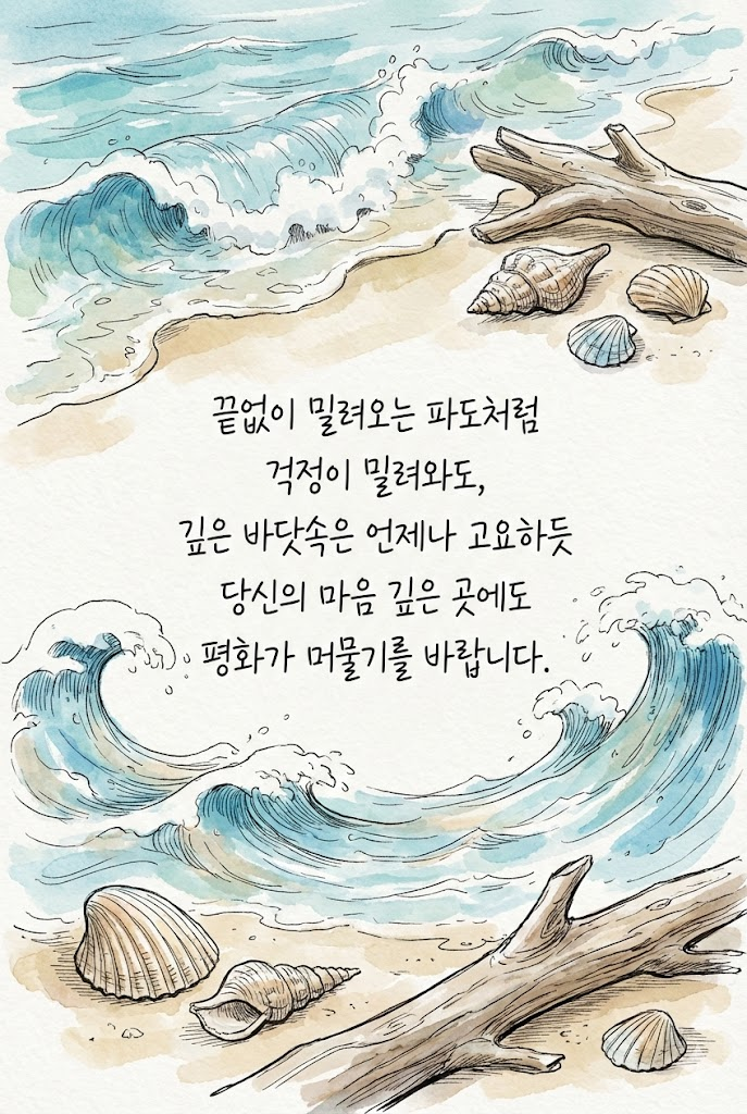 A full-bleed, edge-to-edge digital illustration presenting a refined art piece simulated on high-quality Premium art paper with a subtle texture. There are no borders, margins, or external backgrounds. In the center, a paragraph of handwritten Korean text spanning multiple lines using a fine black ink pen that reads "끝없이 밀려오는 파도처럼 걱정이 밀려와도, 깊은 바닷속은 언제나 고요하듯 당신의 마음 깊은 곳에도 평화가 머물기를 바랍니다.". Around and interspersed with the text block, a beautiful and symbolic illustration of gentle ocean waves crashing on a sandy shore with seashells and driftwood drawn as an expressive sketch using cerulean blue and sepia ink pens, loosely filled in with translucent watercolor washes of aquamarine, sandy beige, and soft white foam. The pen lines remain visible underneath the soft, layered paint. The composition is clean, balanced, and aesthetic. No traditional stamps or seals. High resolution. --ar 2:3