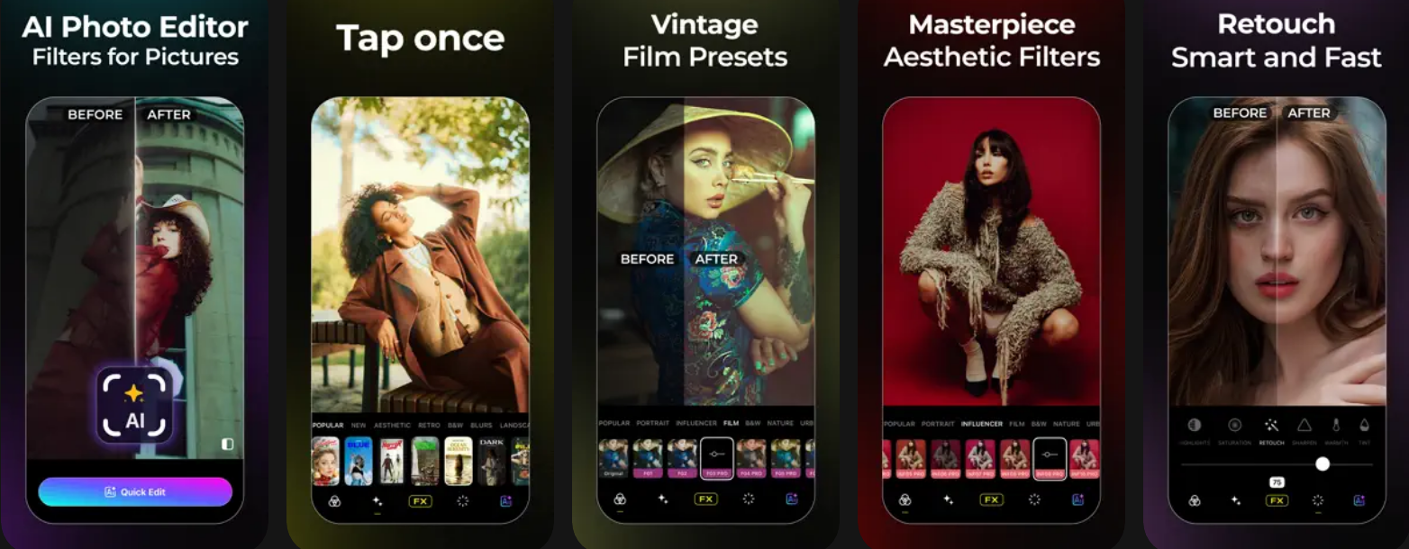 필름 감성, 레트로 무드, 시네마 룩, 인플루언서 톤 — 클릭 한 번으로 완성됩니다.